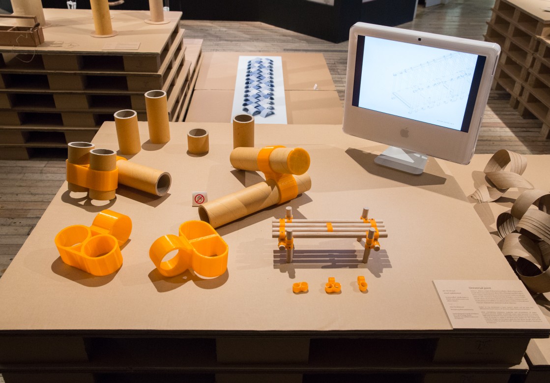 หลังจากพิจารณาวัสดุและผลิตภัณฑ์ปลายทางมากมายจากกระบวนการผลิตกระดาษรีไซเคิลAtelier 2+ สนใจ “แกนกระดาษ” ที่มีคุณสมบัติเด่นคือ แข็งแรงและเบาสามารถนำไปใช้ทำโครงสร้างชั่วคราวในหลายสเกล จึงใช้เครื่องพิมพ์สามมิติสร้าง “ข้อต่ออเนกประสงค์” โดยเพียงตัดแกนกระดาษให้ได้ความยาวที่ต้องการก็สามารถใช้ประกอบโครงสร้างแบบทำมือ (DIY)ตั้งแต่ผลิตภัณฑ์ เฟอร์นิเจอร์ ไปจนถึงสถาปัตยกรรม