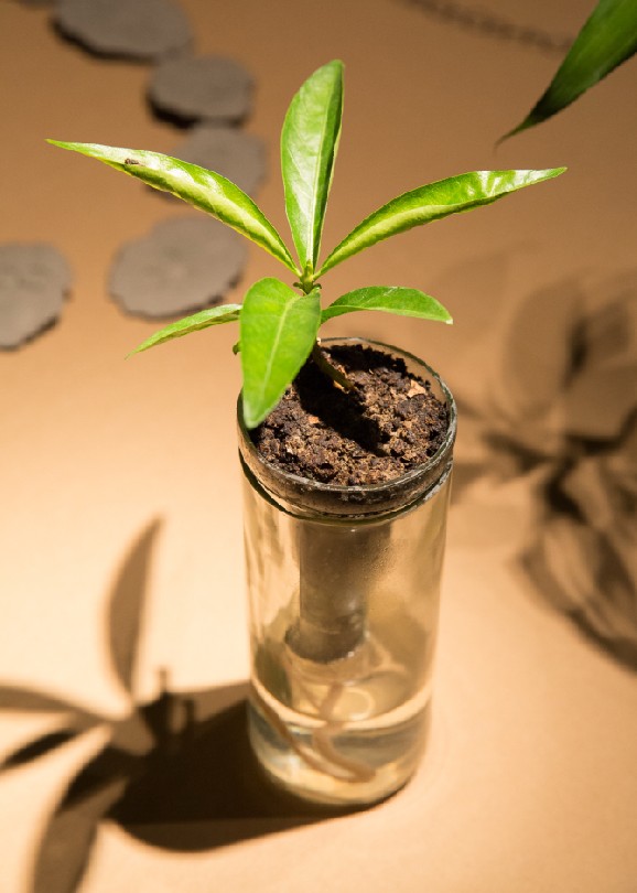 กรินทร์ใช้ดินเซรามิกส์ ผสมกับเศษขุยกระดาษที่ผ่านการรีไซเคิลมา และน้ำดินที่เหลือใช้จากกระบวนการผลิตเครื่องปั้นดินเผา จนได้วัสดุที่มีลักษณะใกล้เคียงกับหินธรรมชาติ ที่มีความพรุนและระบายอากาศ จากนั้นนำมาทดลองปลูกพืชที่ขึ้นตามภูเขาหิน เพื่อจำลองเป็นภูมิทัศน์ที่มีชีวิต