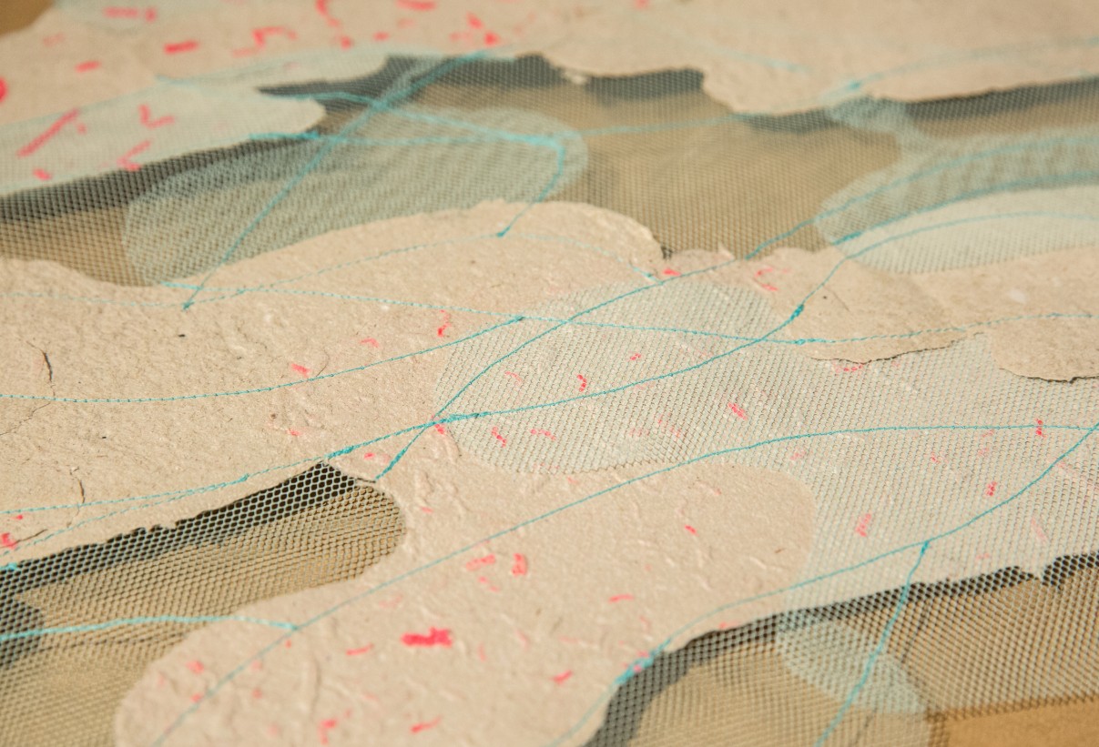 To make freeform-shape textile paper, a customized deckle has been used in this handmade papermaking process. The colors and textures show how the paper pulp floated around the bath. Sarin sewed the paper together with transparent fabric to create a light and opaque interior decoration item with unique textures. Light and shadow plays an important role with this piece.