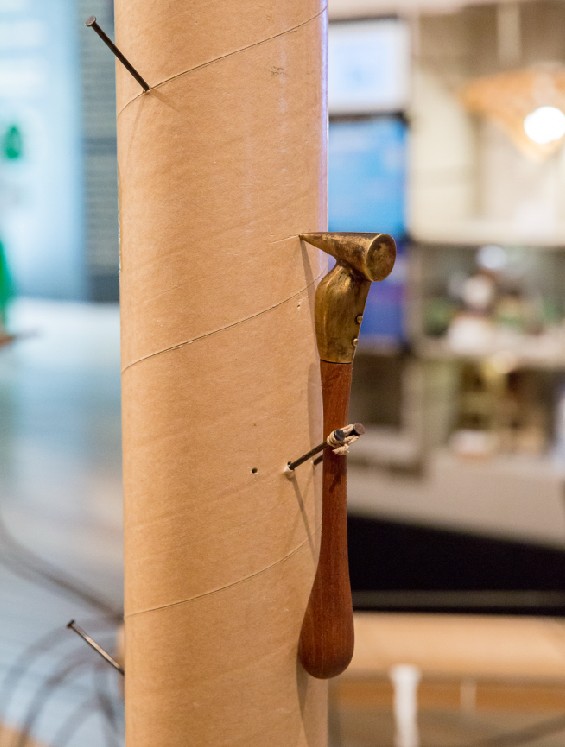 Once the cardboard core is removed, a recycled paper roll can be formedintoa tornadoshape. Thanawat tapped the paper roll with a rubber mallet starting from the inner core without dislodging the core. He then applied glue and kept coiling the paper into the shape of cone. “Tornado” can be used as an audio amplifier for smart phones.