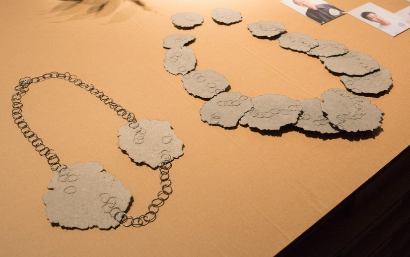 Rudee creates contemporary jewellery that explores a boundless array of materials. During an observation visit to the paper recycling factory,she saw a heap of paper dust from the cutting process and immediately knew that it was the right material for the jewellerythemeshe was working on. The “Temporary Linked” brooches and necklace were created from recycled paper dust, colour, magnet, and oxidized silver925.