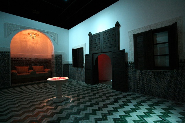 The spatial division of a dwelling in Fes, be it a modest house or a palace, is always the same: a staggered entrance, a central courtyard, and private and communal rooms. It is impossible to distinguish the social standing or wealth of the inhabitant through typological differences. However, the choice of materials and decoration exposes these differences. Dar Sergini dates from the Alaouite period in the 17th century. A staggered entrance provides access to the courtyard, wust el-da r. The floor is covered with zallij (enamelled tiles), in black, white, green and ochre. Around the yard, two principal rooms are found on the longitudinal axis and on the transverse axis, a show space, a fountain and a recess covered with tiles. On the west party wall we find the "water elements" - latrines, a fountain and a kitchen. The mezzanine is taken up with the msid, the classroom of the Koranic school. Upstairs, the layout is the same as it is on the ground floor: two rooms, a gallery, the staircase and the empty space of the patio.