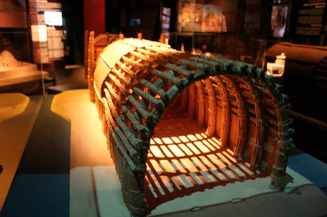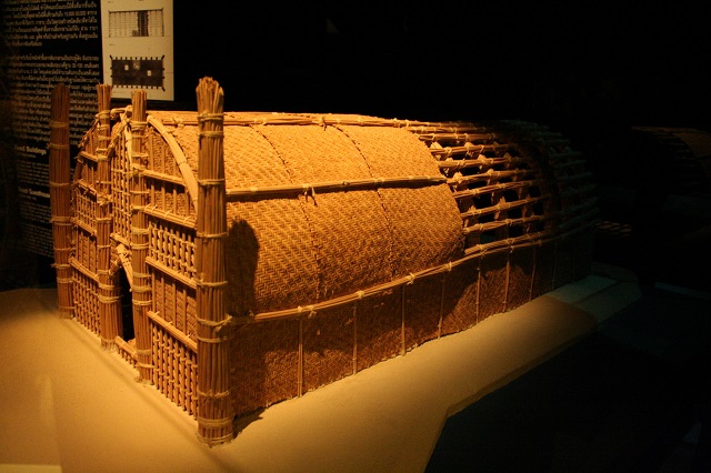 The wooden frame for the roof was supported by two poles on the side and one in the middle. These symbolized the female element and the earth. The cross-beam on top symbolized the male element and the sky. The house and the family exist through the interaction of male and female powers. This is also a reflection of the ordering of contrasting dualities: light and dark, man and woman, earth and sky, culture and nature, public and private. Each item in the house has a place and relationship to every other item. For example, brightly decorated and painted food containers are kept on the gallery, whereas water jugs belong to the lower, moist and earthy part of the house.