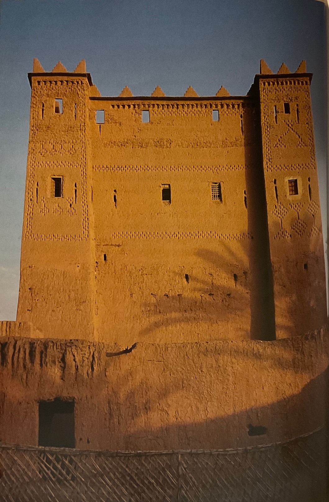 The layered loam houses found in Yemen are also common here. With nose-like protuberances at the level of the penultimate floor and a crenellated parapet on the roof, they are reminiscent of residential castles. The edges of the individual lavers of loam are accented by white stripes. Recently, the occupants of these houses have begun to adorn the facade near the entrance with wide colorful stripes. The interiors are also brightly decorated. The whitewashed walls of the reception rooms are painted with detailed geometric and floral designs. Women specialize in this work. They used to collect the natural ingredients for the coloring themselves, but today they use synthetic paints. These have much brighter colors and thus increase the scope for ornamentation.