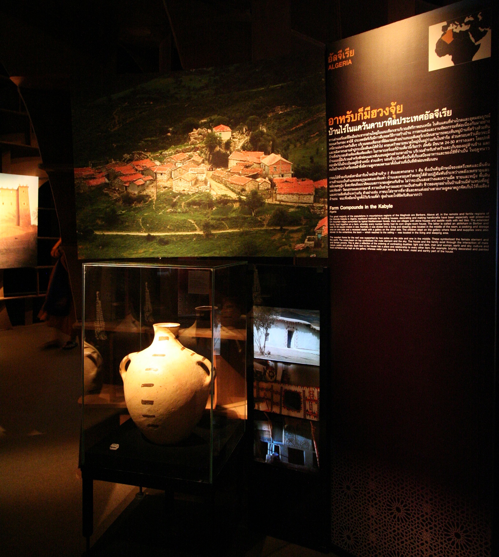 The great majority of the populations in mountainous regions of the Maghreb are Berbers. Above all, in the remote and fertile regions of the Grande Kabylie in Algeria, traditional methods for building houses, decorating and making handicrafts have been especially well preserved. On mountain ridges surrounded by typical Mediterranean forests, there are villages with stone houses and saddle roofs with red tiles. The extended family lived together on a farm, whereby every nuclear family had its own single-room house. The latter is called an akhkham in Berber and was 24-30 square meters in size. Normally, it was divided into a living and sleeping area located in the middle of the room, a cooking and storage area on one side and a recessed stable with a gallery on the other side. The children slept on the gallery where food and supplies were also stored. In the wintertime, the loon - which reached to the ceiling - was located in the living and sleeping area.