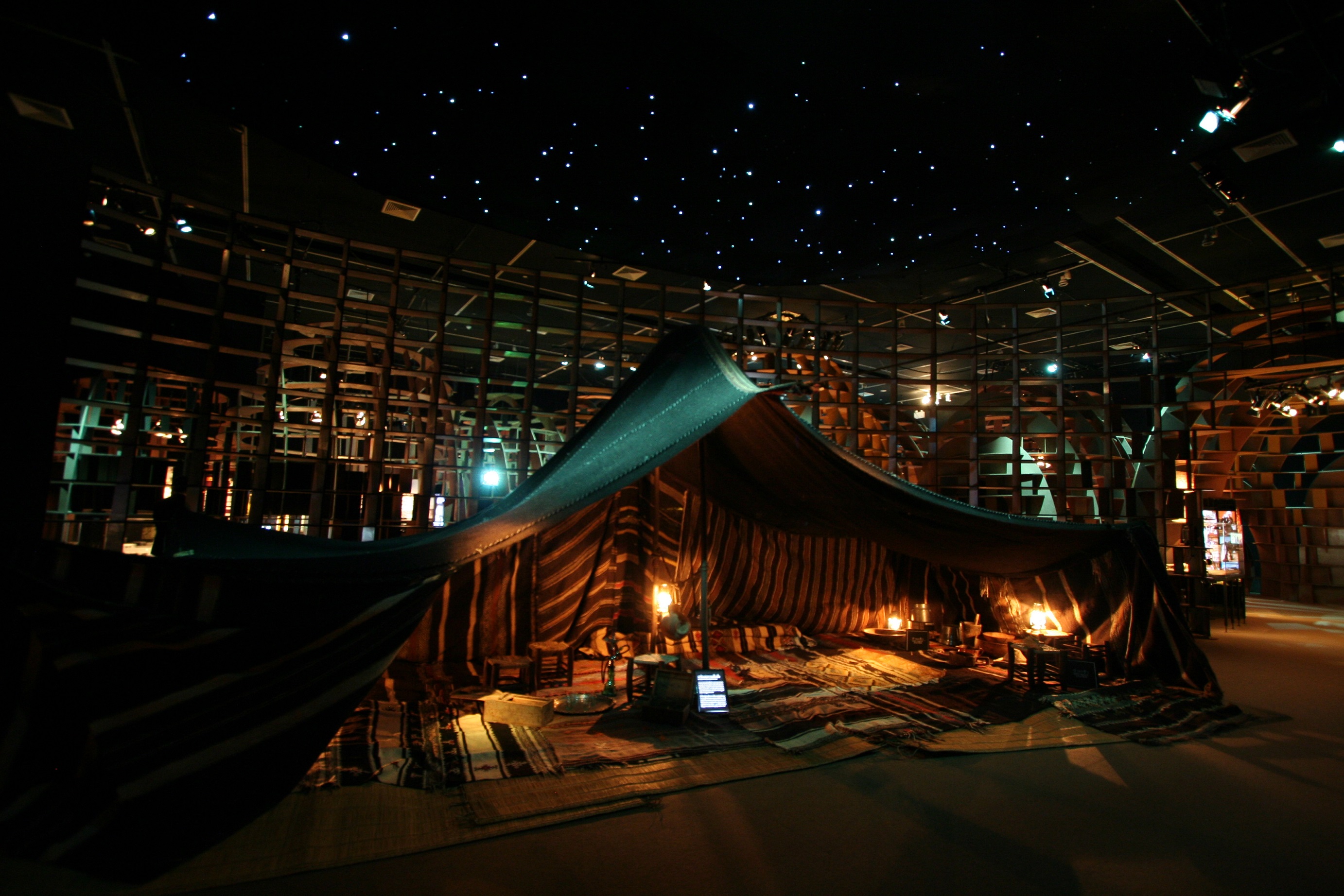 The Warka, who belong to the Bedouin tribe, use a black tent. The generic term black tent relates to the same type of tent found from Mauritania to the Himalayas, which originates in the Middle East. It is there that the domestication of goat and sheep, whose hair is used to make the covering, took place. With the domestication of the dromedary as a pack animal, the black tent really expanded, as its size and therefore weight could be increased. Meanwhile, each of the peoples has contributed their own characteristics. For example, in Tibet, yak hair is used for the covering; in the Arabian deserts the tent is flattened to resist sand storms, whilst in North Africa the roof becomes more pointed to allow the rain to drain away.