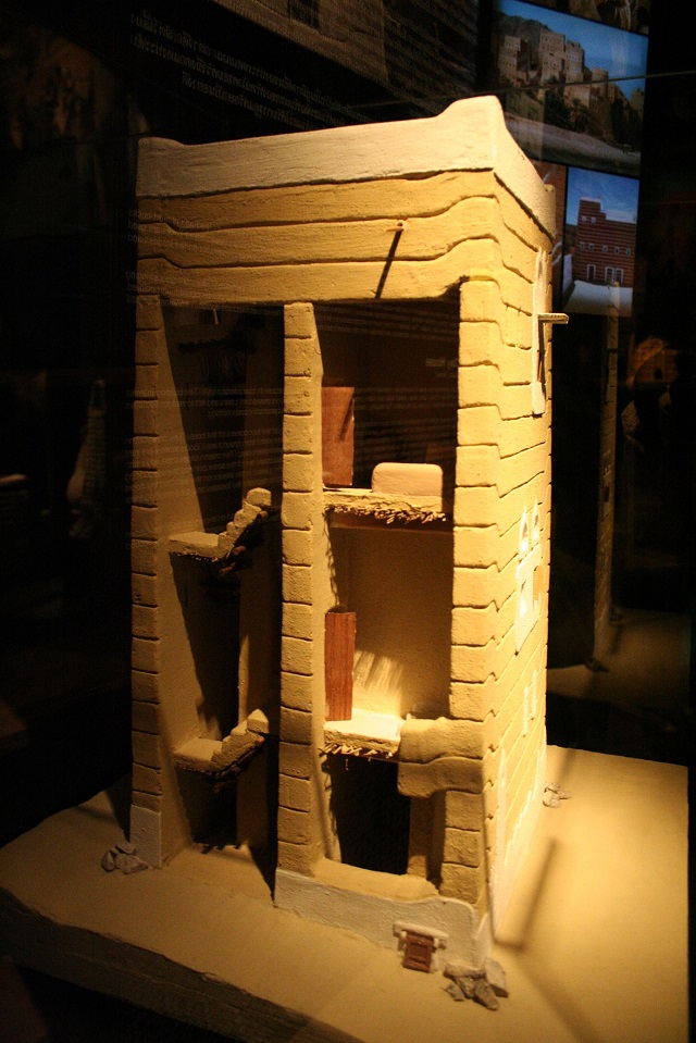 The division of space is similar to that of other Yemeni houses: on the ground floor, a stable and a storeroom for agricultural implements; on the first floor, two depots; on the second, a room occupied by the mother of the family and her children; and on the third, the kitchen and food store. The kitchen is equipped with a massively built heater/bread oven, situated in the curve of the room. Condensation and odors are evacuated through a hood and then a shaft which leads out to the open air. Several larders equipped with an aeration system in perforated brickwork overlap on the frontage. Each house possesses flour millstones, placed on the ground floor, near the grain reserves. The highest (loor belongs to the head of the family and his son. There is also a washroom, indispensable in every Yemeni household for the ritual ablutions before prayers.