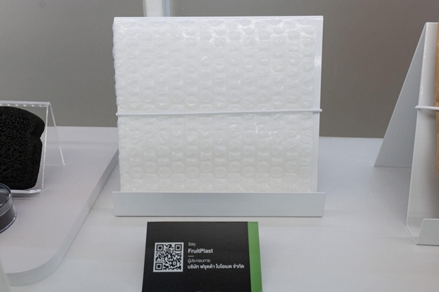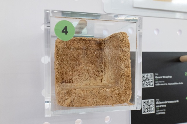 วัสดุทดแทนโฟมบรรจุภัณฑ์จากเส้นใยเห็ด ผลิตมาจากวัสดุเหลือใช้ทางการเกษตรและเส้นใยเห็ด ด้วยเทคโนโลยีพิเศษที่ทำให้มีกระบวนการผลิตที่ปล่อยคาร์บอนไดออกไซด์น้อยกว่า ใช้พลังงานน้อยกว่า และย่อยสลายตามธรรมชาติ (Home Compostable) ภายใน 90 วัน มีคุณสมบัติลอยน้ำ น้ำหนักเบา เป็นฉนวนกันความร้อน ทนไฟ รับแรงกระแทกได้ดี สามารถขึ้นรูปเป็นบรรจุภัณฑ์ได้ตามต้องการ