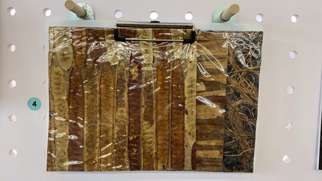 แผ่นใบตองแห้งผสานกับผ้าเส้นใยธรรมชาติ อัดแผ่นโดยไม่เคลือบผิววัสดุ โดยใช้นวัตกรรมธรรมชาติจากยางกล้วย ผสมผสานใบตองกว่า 7 สายพันธุ์ในพื้นที่จังหวัดอุตรดิตถ์ สร้างลวดลายไม่ซ้ำในแต่ละแบบและไม่จำกัดขนาด แต่หากใช้ใบแห้งสายพันธุ์เดียวทั้งใบจะถูกกำจัดขนาดอยู่ที่ประมาณ A3 สีสันใบตองจะมีสีที่แตกต่างกันไปตามธรรมชาติ