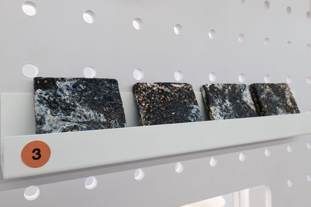 แผ่นคอมโพสิตจากเศษเครื่องปั้นดินเผาในชุมชนด่านเกวียน ที่เกิดจากการแตกหักเสียหายในระหว่างกระบวนการผลิต ผสมกับฝาขวดน้ำ ซึ่งเป็นขยะพลาสติกใช้แล้วทิ้ง ที่สร้างสรรค์ลวดลายและพื้นผิววัสดุในสัดส่วนที่แตกต่างกัน ทั้ง 40:60 หรือ 30:70 หรือสัดส่วนอื่น ๆ ตามที่ต้องการได้ สามารถใช้ในงานตกแต่งภายในทดแทนวัสดุอื่น ๆ เช่น แผ่นตกแต่งผนัง แท่นวางของ