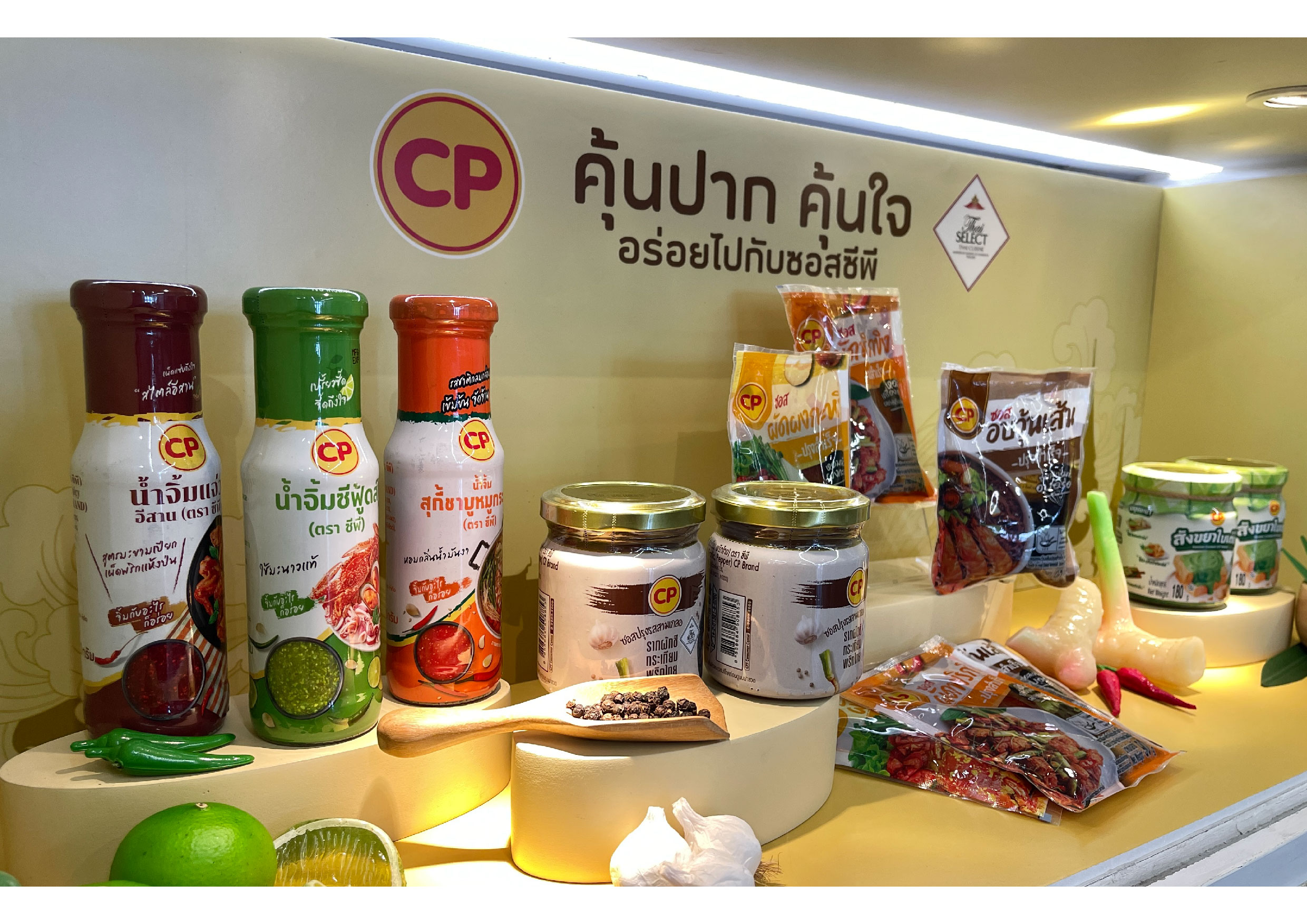 CP ยกทัพ “ซอสไทยแท้” ร่วมจัดแสดงกับ TCDC พร้อมเสิร์ฟรสชาติทั้งคาวและหวานจากวัตถุดิบไทยแท้กว่า 80% ในงานจัดแสดงร่วมกับ TCDC ครั้งนี้ CP ได้นำเสนอผลิตภัณฑ์ซอสปรุงอาหารสำเร็จรูปเมนูไทยที่ได้รับการรับรองคุณภาพด้วยตรา Thai Select ซึ่งออกโดยกรมส่งเสริมการค้าระหว่างประเทศ (DITP) เพื่อยืนยันถึงรสชาติแบบไทยแท้ และการใช้วัตถุดิบจากประเทศไทยมากกว่า 80% โดยภายใต้แนวคิดที่ต้องการผลักดัน “รสชาติไทย” ให้เข้าถึงผู้บริโภคได้อย่างสะดวกและร่วมสมัยมากขึ้น CP ได้คัดเลือกซอสไทยยอดนิยมที่อยู่คู่ครัวไทยมาอย่างยาวนานมาจัดแสดง ไม่ว่าจะเป็น “ซอสปรุงรสสามเกลอ” ที่รวมความหอมกลมกล่อมของรากผักชี กระเทียม และพริกไทย ไปจนถึงน้ำจิ้มยอดฮิตอย่างน้ำจิ้มแจ่ว น้ำจิ้มซีฟู้ด และน้ำจิ้มสุกี้ ชาบู หมูกระทะ และยังปิดท้ายด้วยซอสสังขยาใบเตยกลิ่นหอมละมุน สำหรับเสิร์ฟเป็นของหวาน ตอกย้ำความหลากหลายของซอสไทยที่สามารถเติมเต็มรสชาติได้ครบทั้งคาวและหวานในมื้อเดียว